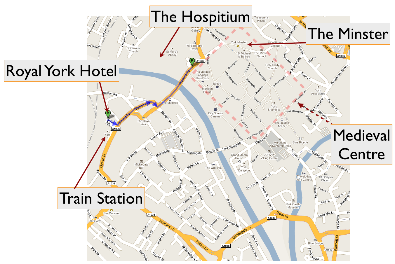 Here is a map showing the conference venue, and the location of the pre-conference reception on the Sunday evening. The main medieval centre is shown, but there are also medieval parts on the opposite side of the river. The orange road shown on the map roughly follows the medieval city wall. Click on the map to download the full-size version.